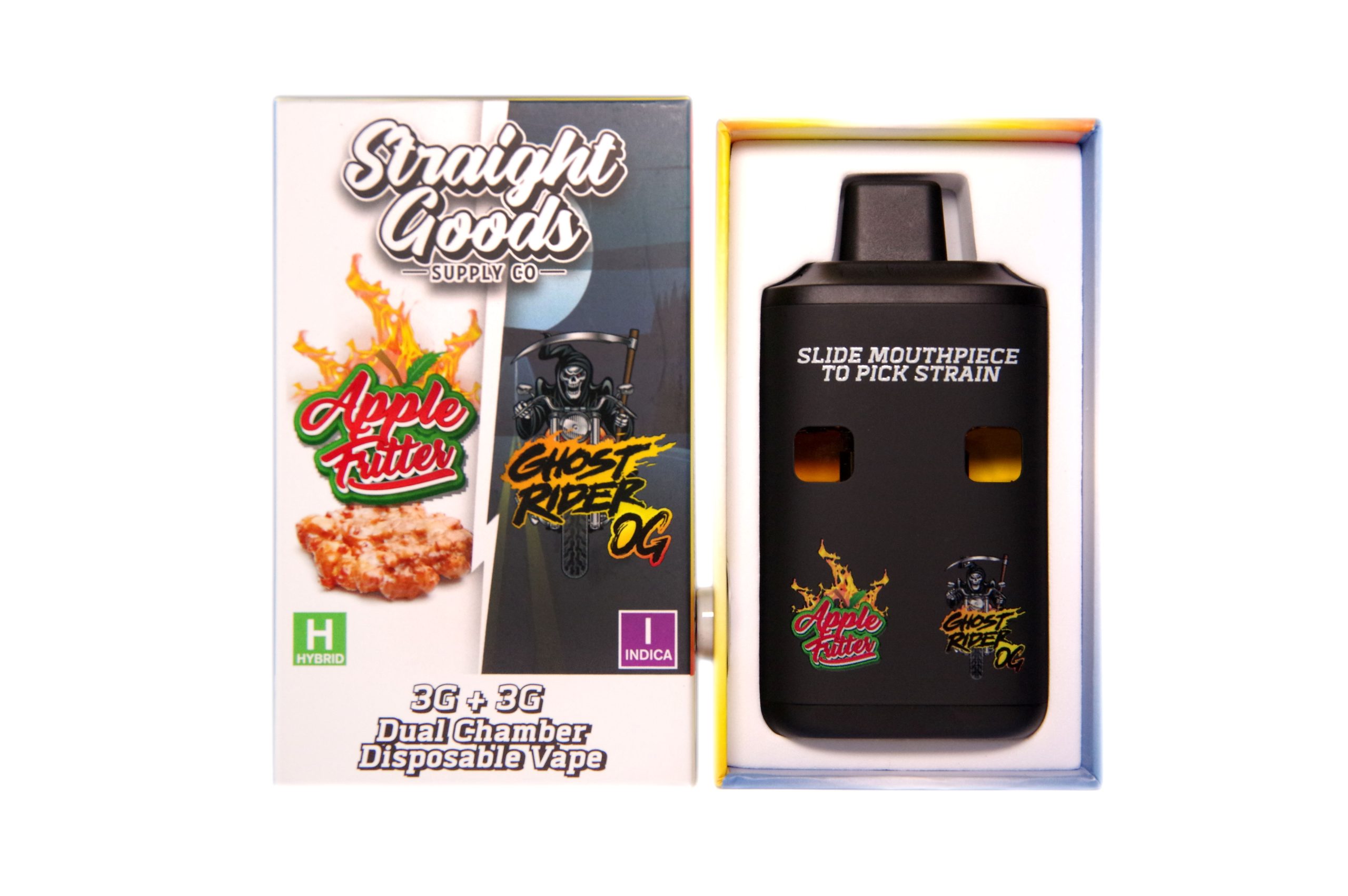 Straight Goods Supply Co. 6 Gram Dual Chamber Disposable Vapes – Apple Fritter + Ghost Rider OG THC Distillate