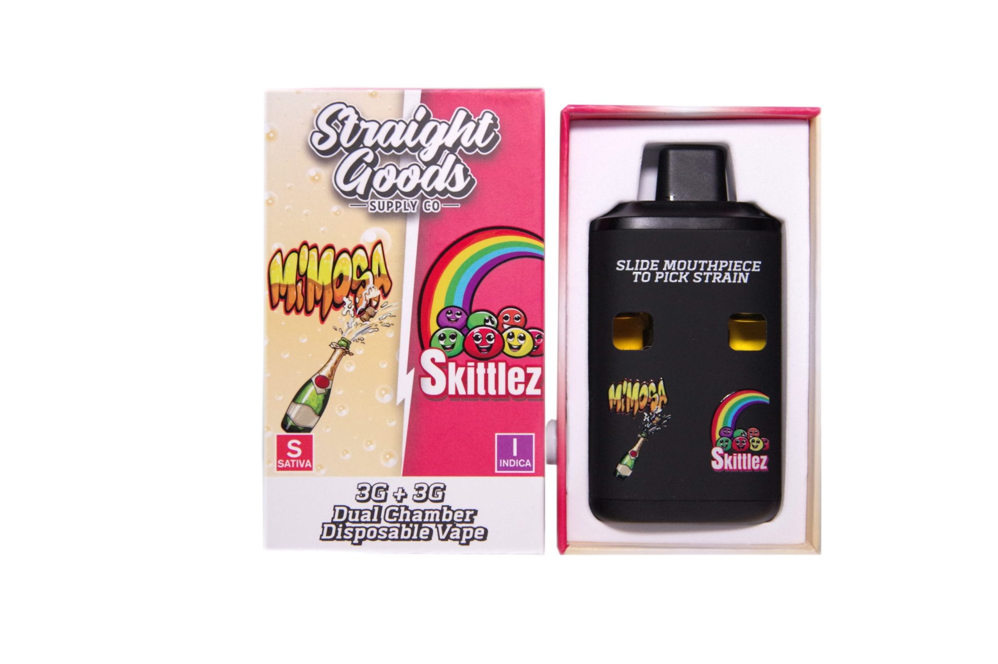 Straight Goods Supply Co. 6 Gram Dual Chamber Disposable Vapes – Mimosa + Skittlez THC Distillate