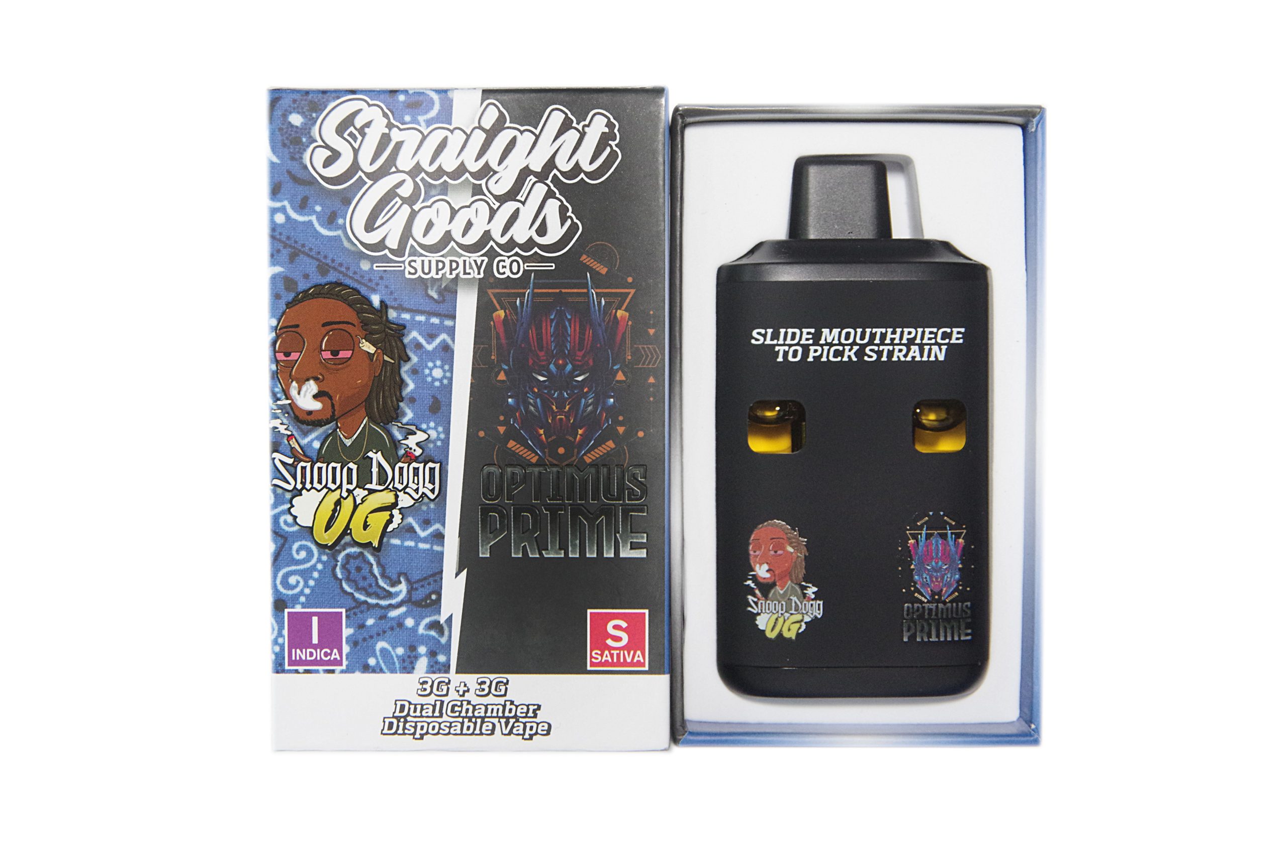 Straight Goods Supply Co. 6 Gram Dual Chamber Disposable Vapes – Snoop Dogg OG + Optimus Prime THC Distillate